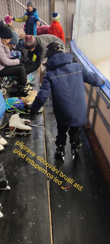 Ze školy jsme jeli vlakem na Ostravici a přešli jsme ze zastávky přímo k hale, kde nás čekala krásně upravená ledová plocha. Žáci, kteří neměli svoje brusle, měli možnost si je půjčit přímo na místě.