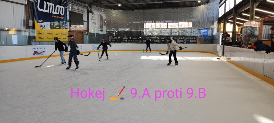 Na ledě jsme rozdělili bruslaře a žáky, kteří stáli na bruslích poprvé a trochu se báli. Po půl hodině metodiky bruslení – objížďky kuželů, zatáčení, kdy všichni se rozbruslili alespoň s pomocí, jsme zahájili soutěž družstev v hokeji, tentokrát bylo rozdělení jasné – chlapci z 9.A proti 9.B.