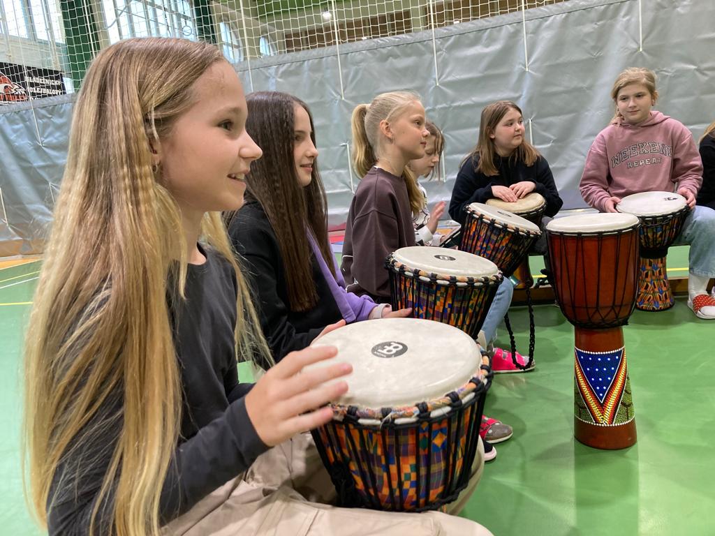 Prvňáci, čtvrťáci a 5. C si pod vedením lektorky Zuzany Chýlek Váchové vyzkoušeli bubnování na africké bubny.