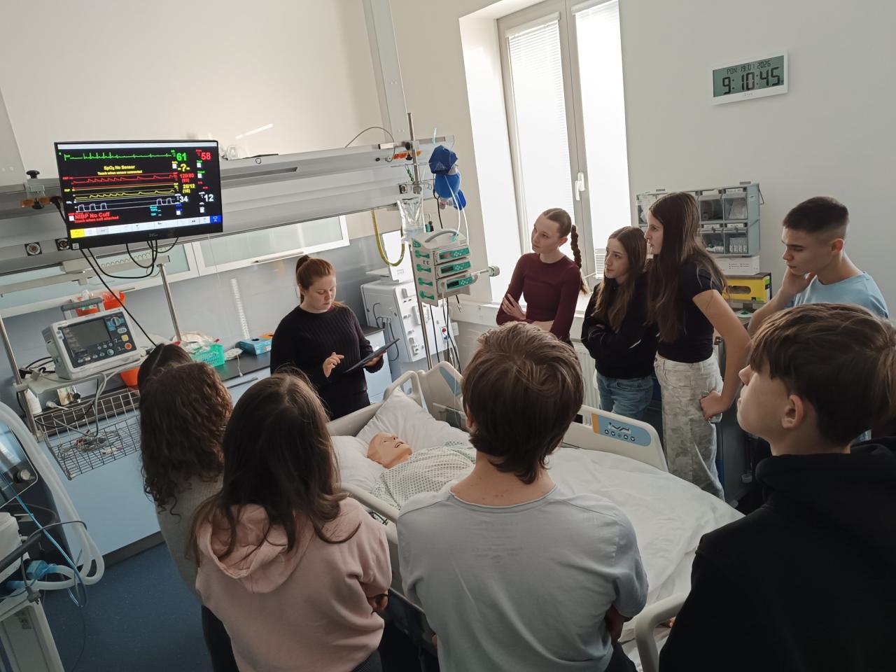 Během hodinové intenzivní prohlídky se žáci ocitli v prostředí, které je k nerozeznání od skutečné nemocnice. Místo lidí zde však v postelích leží sofistikované simulátory. Tito „robotičtí pacienti“ mrkají, dýchají, mají měřitelný tep a dokážou reagovat na podanou léčbu. Osmáci postupně prošli klíčová pracoviště: