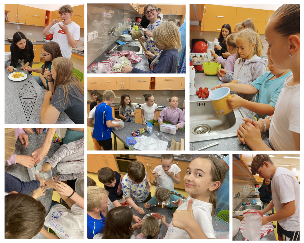 A to ještě zdaleka nebylo všechno. Holky sedmačky si pro nás připravily ukázku smažené zmrzliny, která voněla po kokosu a chutnala báječně. Moc jsme si pochutnali a společné „zmrzlinování“ užili. Jen máme trochu strach, ať si naše společné setkávání v kuchyni sedmáci nerozmyslí, protože na ně tentokrát moc zmrzliny opravdu nezbylo. J