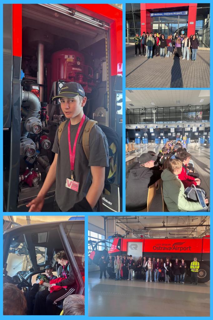 Následně nás čekala druhá, akčnější část exkurze. Letištní hasiči nás autobusem převezli přes samotnou ranvej až na stanici integrovaného záchranného systému (IZS). Tam nám ukázali svou moderní techniku a speciální hasicí vozy, které jsou uzpůsobeny pro hašení letadel. Dozvěděli jsme se, jak vypadá jejich zásah při mimořádných událostech, a mohli jsme si prohlédnout i jejich tréninkový polygon, kde hasiči cvičí reálné situace.