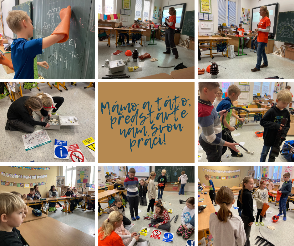 Maminka Matěje nám představila svou práci pro společnost ČEZ. Dětem promítla a okomentovala velmi zajímavou prezentaci, kde se dozvěděly mnoho odpovědí na svoje otázky. Bylo patrné, že děti si uvědomují, že elektřina je součástí jejich života a že je téma zaujalo. Nadšení dětí se ještě vystupňovalo, když si mohly vyzkoušet nejrůznější technické a ochranné pomůcky, které paní Čempel při své práci využívá. V závěru byly děti za svou pozornost a upřímné zaujetí odměněny drobnými dárky.
