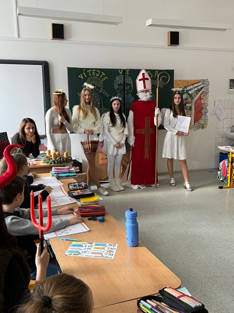 Během prvních čtyř hodin dvě Mikulášské družiny tvořené žáky devátých tříd a členy žákovského parlamentu navštívily všechny třídy prvního stupně a některé třídy druhého stupně. Vyučovací hodiny byly naplněny šumem andělských křídel, chřestěním čertích řetězů a vlídným úsměvem Mikulášovým. Vstup Mikulášovy družiny do tříd vždy provázelo hluboké ticho spojené s očekáváním nadílky. Když se děti osmělily, vždy předvedly to nejlepší, co se během prvních tří měsíců ve škole naučily, zarecitovaly básničky, zazpívaly písničky. Mikuláš je pak vždy odměnil dobrotami, které u dětí vykouzlily pocit štěstí a radosti.