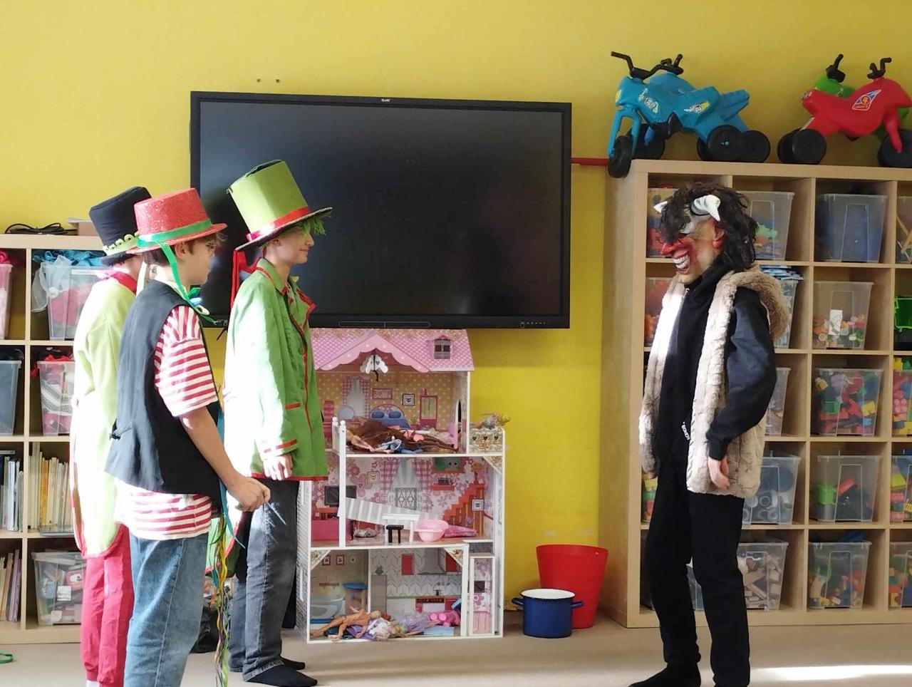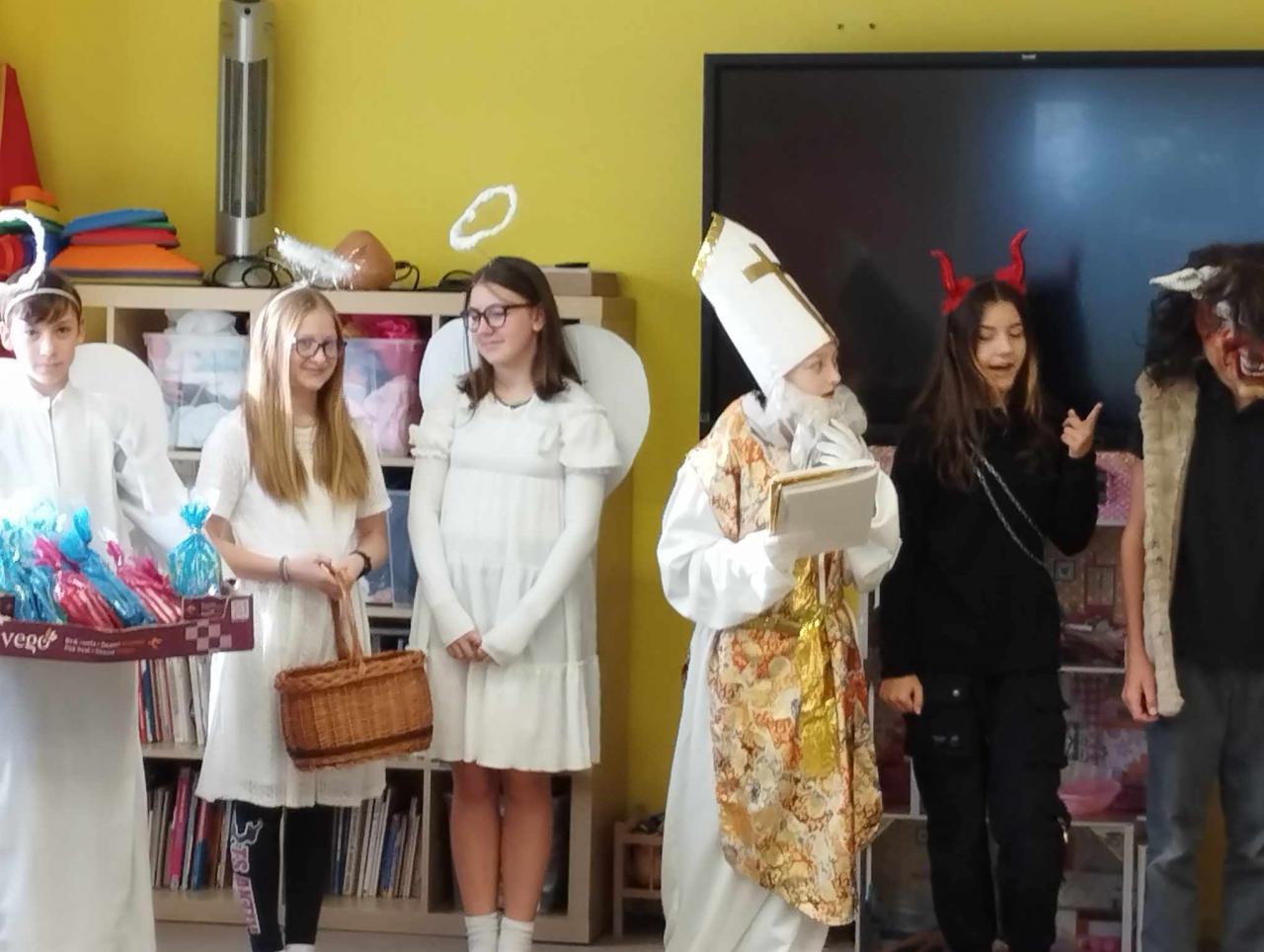 Nejprve jim předvedli svoji novou vodnickou pohádku, která se dětem moc líbila. Pak se převlékli do kostýmů čertů, Mikulášů a andělů a vtrhli mezi děti, aby je opět pobavili. Pro děti měli napečené perníčky ve tvaru rybiček. Někteří měli opravdu z čertů strach, ale po obdržení perníčků a výslužky, kterou jim nachystaly paní učitelky, se spokojeně usmívali.