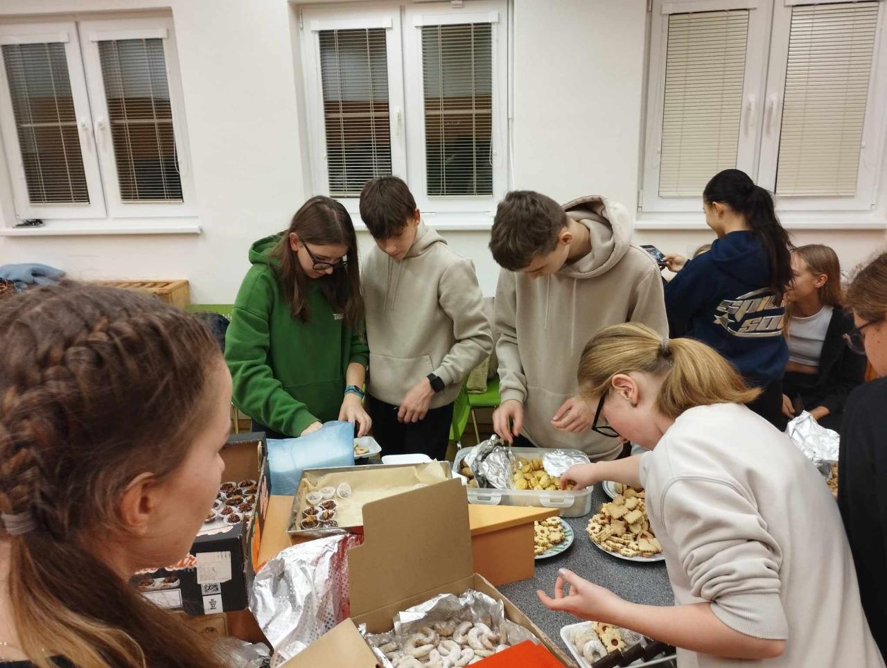 Během nocování ve škole jsme dodělávali koláčky a postupně jsme vše balili, abychom byli připraveni na vánoční trh, který proběhl 29. 11. Samozřejmě, že jsme během „přespávačky“ stihli naši oblíbenou hru na schovávanou, připravili chutnou večeři a zhlédli jsme film. Nocování se nám velice líbilo, stejně jako prodej na Vánočním jarmarku. Z vydělaných peněz budeme věnovat část na zakoupení hraček pod Strom andělů v našem frýdlantském kostele.
