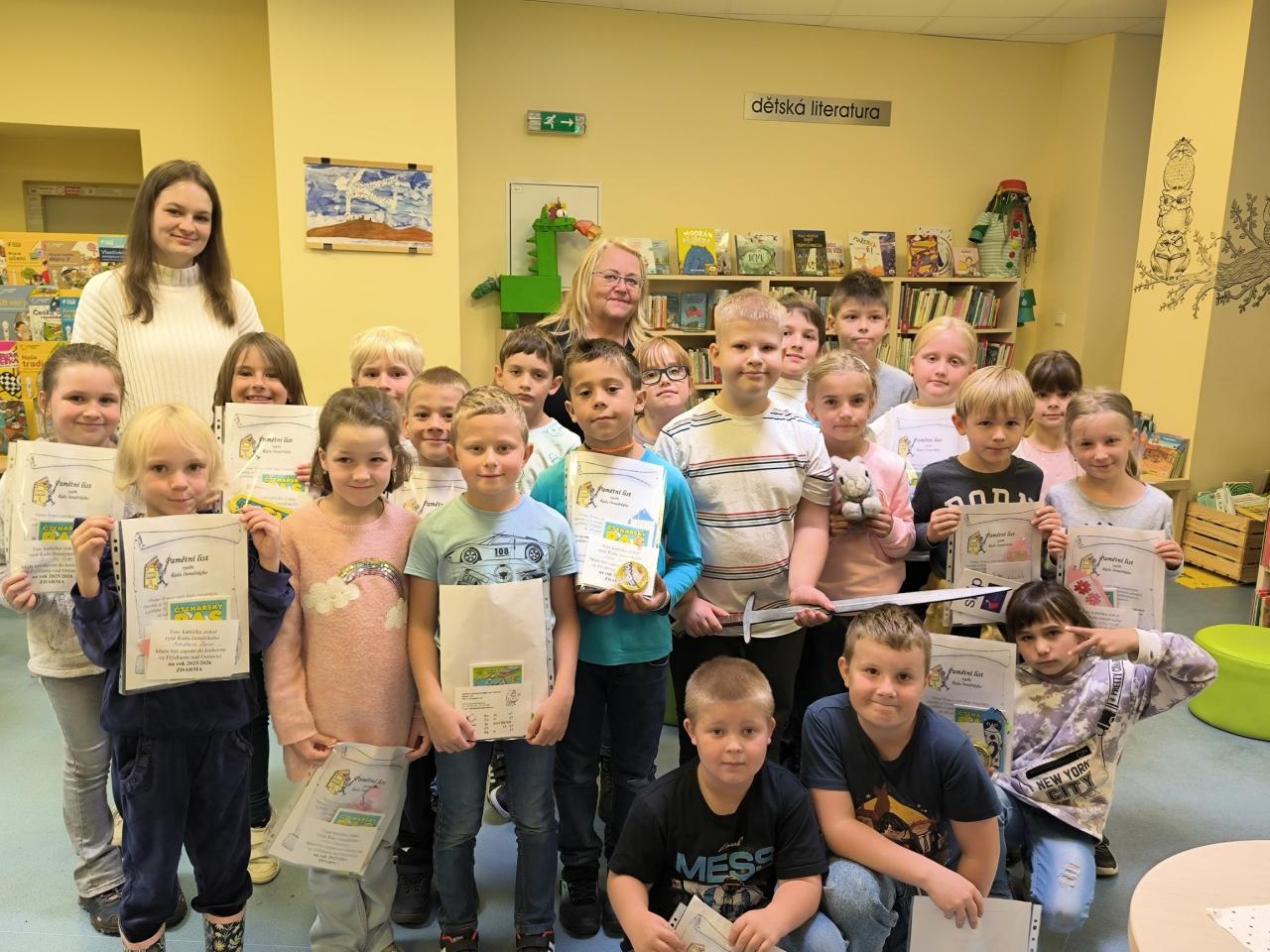 Pasování skončilo a žáci plni zážitků se vrátili do školy, kde si ještě dál povídali o možnostech a výhodách půjčování knih v knihovně.