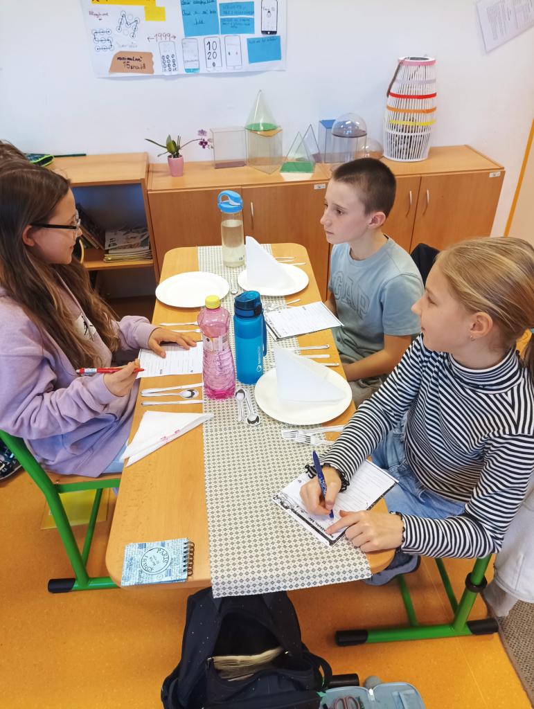 Žáci nejprve správně prostřeli tabuli a seznámili se se základními pravidly stolování. Poté se ve skupinkách věnovali konverzaci na předem daná témata, přičemž dbali na zdvořilé vyjadřování a respekt k ostatním. Celkovou atmosféru podtrhovala jazzová hudba, která dodala našemu "podniku" ten správný šmrnc.