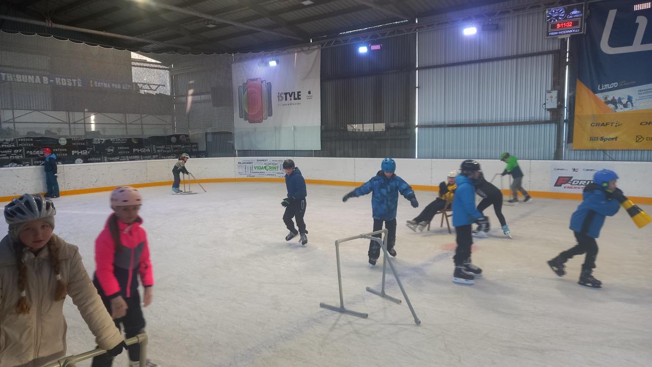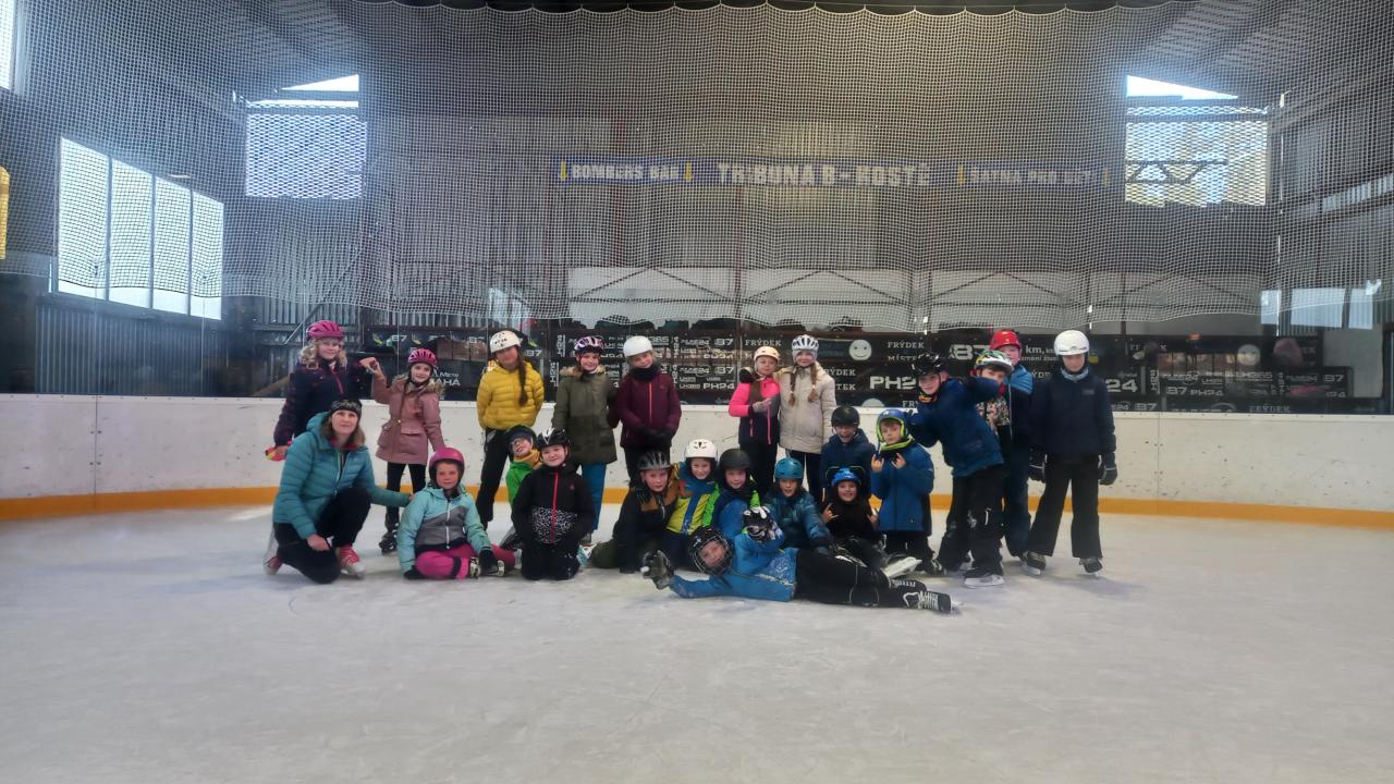 Ledová plocha je jen naše. Někteří krouží obstojně samostatně, jiní si raději berou oporu, ale všichni vypadají natěšeně a odhodlaně. Postupně měníme směry jízdy, stavíme kužely pro slalom a konečně dojde i na hokej. V průběhu hodiny už se někteří odvážně pustili i opor, pořád je někdo na zemi, ale vždycky má u toho rohlík na tváři. Je to až překvapivé. Hodina uplyne než by jeden řekl švec.