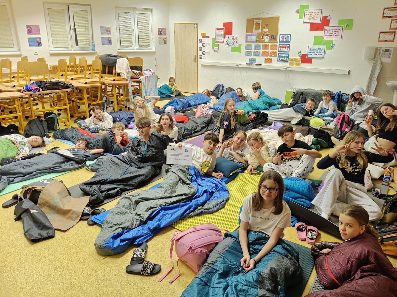 Večer jsme se vlakem vrátili zpět do Frýdlantu a přesunuli se do školy, kde začala druhá část našeho dobrodružství – přespání. Ve třídě jsme si připravili spacáky, povídali si, hráli hry a užívali si společný čas i mimo lavice.