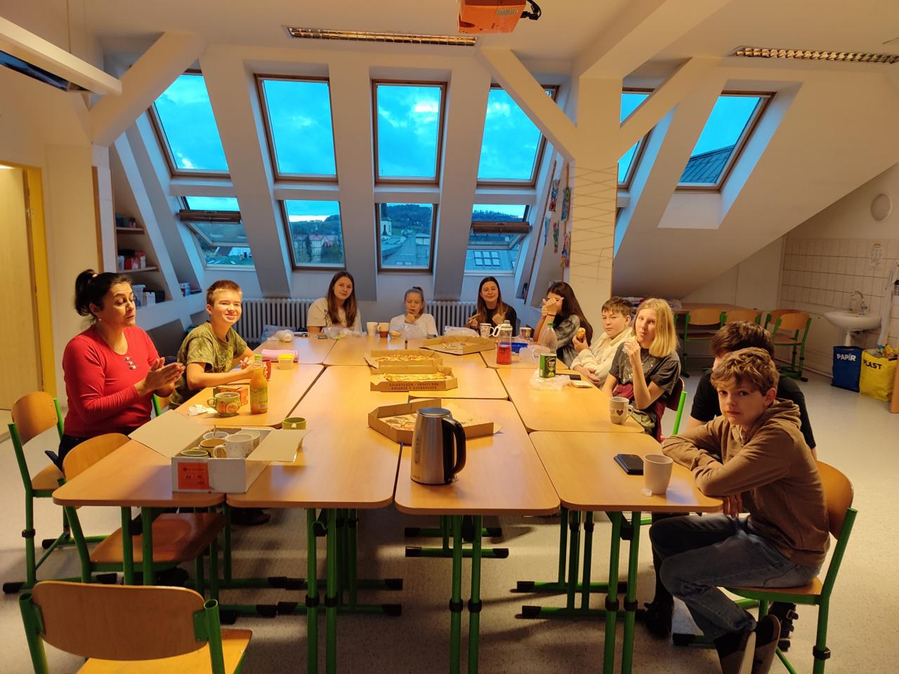 Naše předvánoční přespávačka pokračovala ve třídě. Slibovaná večeře na sebe nenechala dlouho čekat. Než jsme stihli ještě něco málo tvořit na jarmark nebo si zahrát deskovky, pizza byla tady.