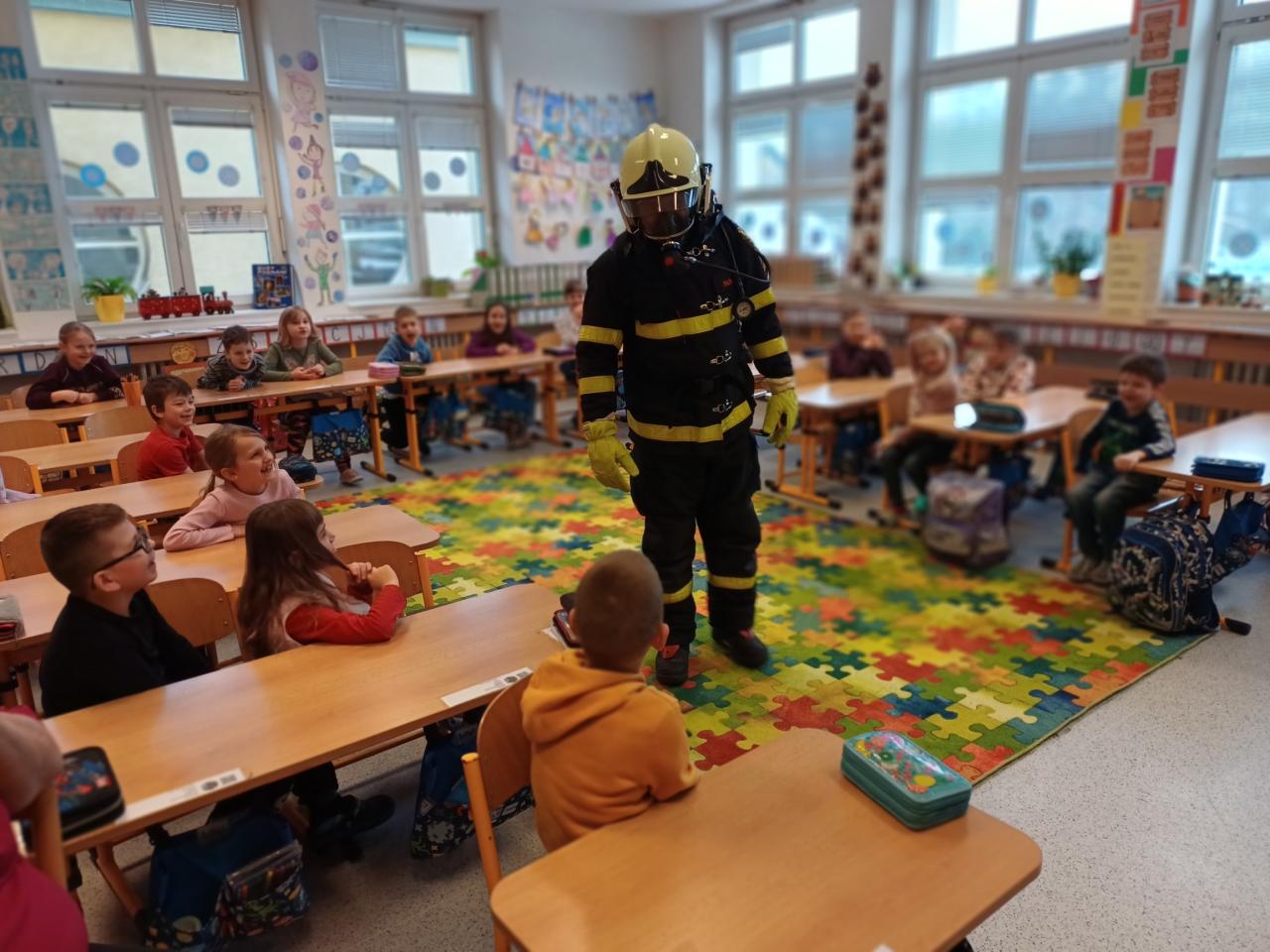 Děti se dozvěděly, co všechno hasiči dělají, u jakých událostí zasahují a jak náročná i zodpovědná je jejich práce. Pan Cvik jim přinesl ukázat skutečný hasičský zásahový oblek, masku i hasicí přístroj. Žáci si tak mohli lépe představit, jak hasiči vypadají při zásahu a jaké vybavení používají. Velký důraz byl kladen také na zopakování důležitých telefonních čísel tísňového volání a na správné chování v krizových situacích.