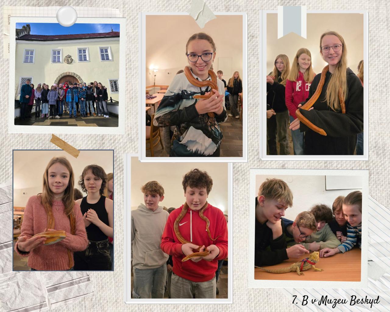 Brzy ráno jsme se dopravili vlakem na nádraží do Frýdku-Místku, odkud jsme se přemístili svižnou procházkou přes město až na frýdecké náměstí, kde se muzeum nachází. Po příchodu nás přivítala milá paní lektorka, která měla pro žáky připravené dvě velmi zajímavé přednášky o plazech – Hodinka s hademJeštěři a ještěrky.