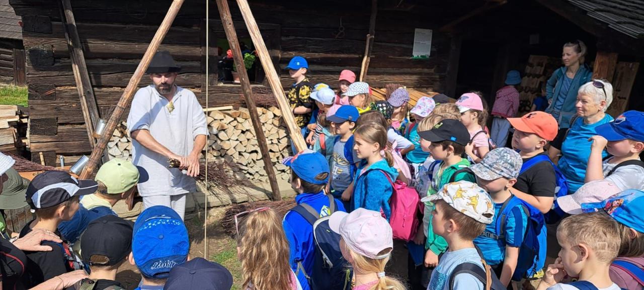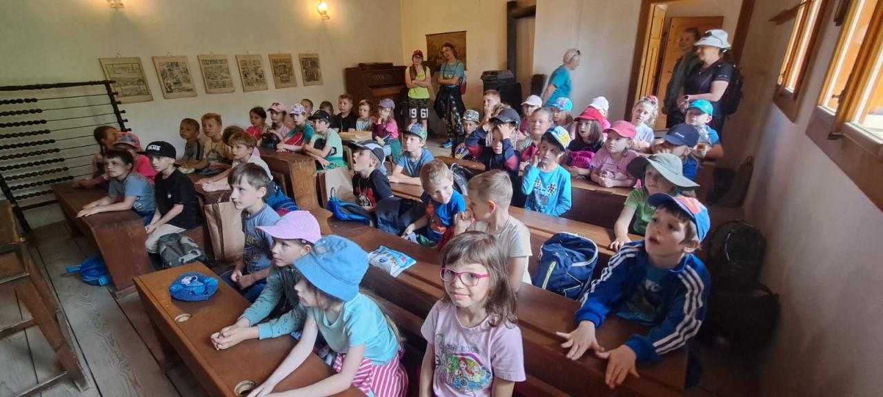 ve Valašské dědině, která je známá nejen svými malebnými dřevěnicemi, z nichž každá má hlubokou historii, ale i nádhernou okolní přírodou. Příjemným zpestřením naší procházky bylo poutavé vyprávění strýčků a tetiček o různých lidových řemeslech nebo o životě našich předků. Dozvěděli jsme se mnoho nových informací o práci košíkáře, mlynáře nebo hospodářů. Nejzajímavější byla prohlídka staré školy, ve které nás vítala paní učitelka, v ruce měla ukazovátko a učila. Vysvětlila nám, že děti v dávných dobách musely sedět v malých a tvrdých lavicích, psaly na tabulku kamínkem a aktovku měly ze dřeva. Učení v takové škole bychom už asi nechtěli zažít.