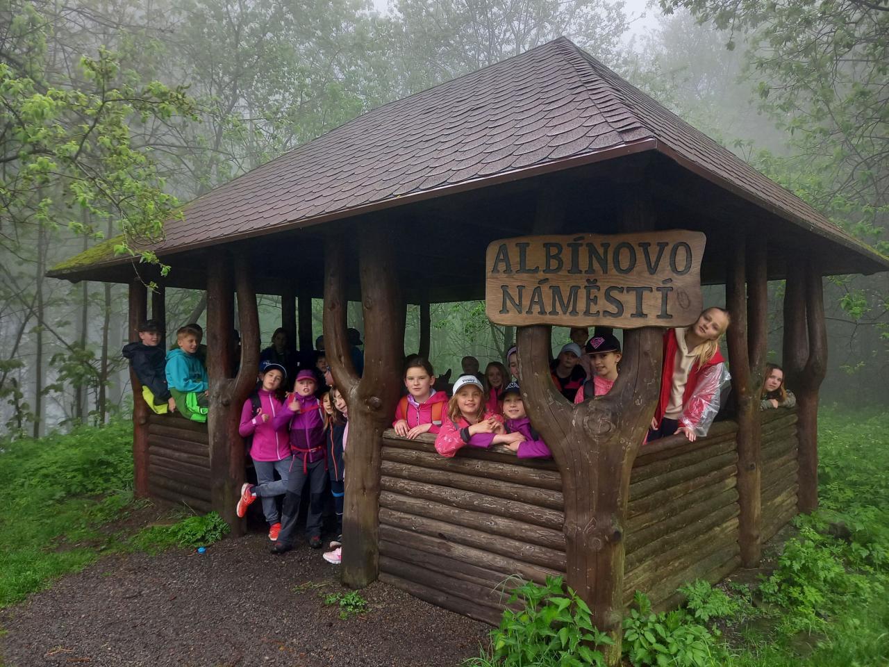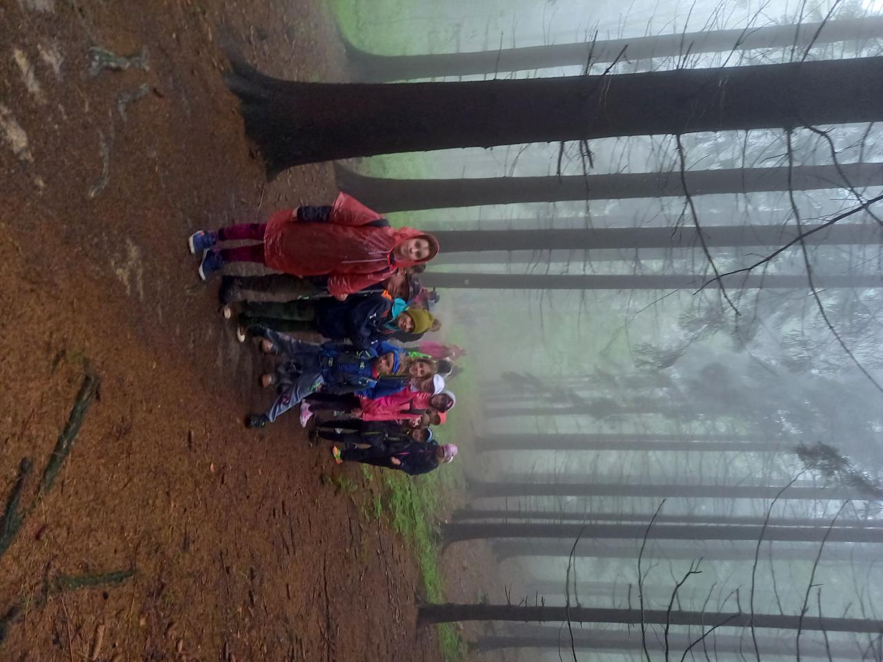 Naše první zastávka byla v hospůdce U Veličků, kde nás již v 8.15 hodin vlídně přivítali nejmladší z rodu Veličků. Mohli jsme se občerstvit a nakoupit tolik důležité dobroty a suvenýry. A šlapalo se dále směrem na Albínovo náměstí, okolo Zbuje a cestou z kopce dolů k hotelu Sepetná. Cesta mlhavým lesem a přes rozvodněné potůčky byla opravdu hodně tajemná až strašidelná, ale náladu nám počasí nepokazilo. Zpívali jsme písničky všech hudebních žánrů. Prostě písnička střídala písničku.