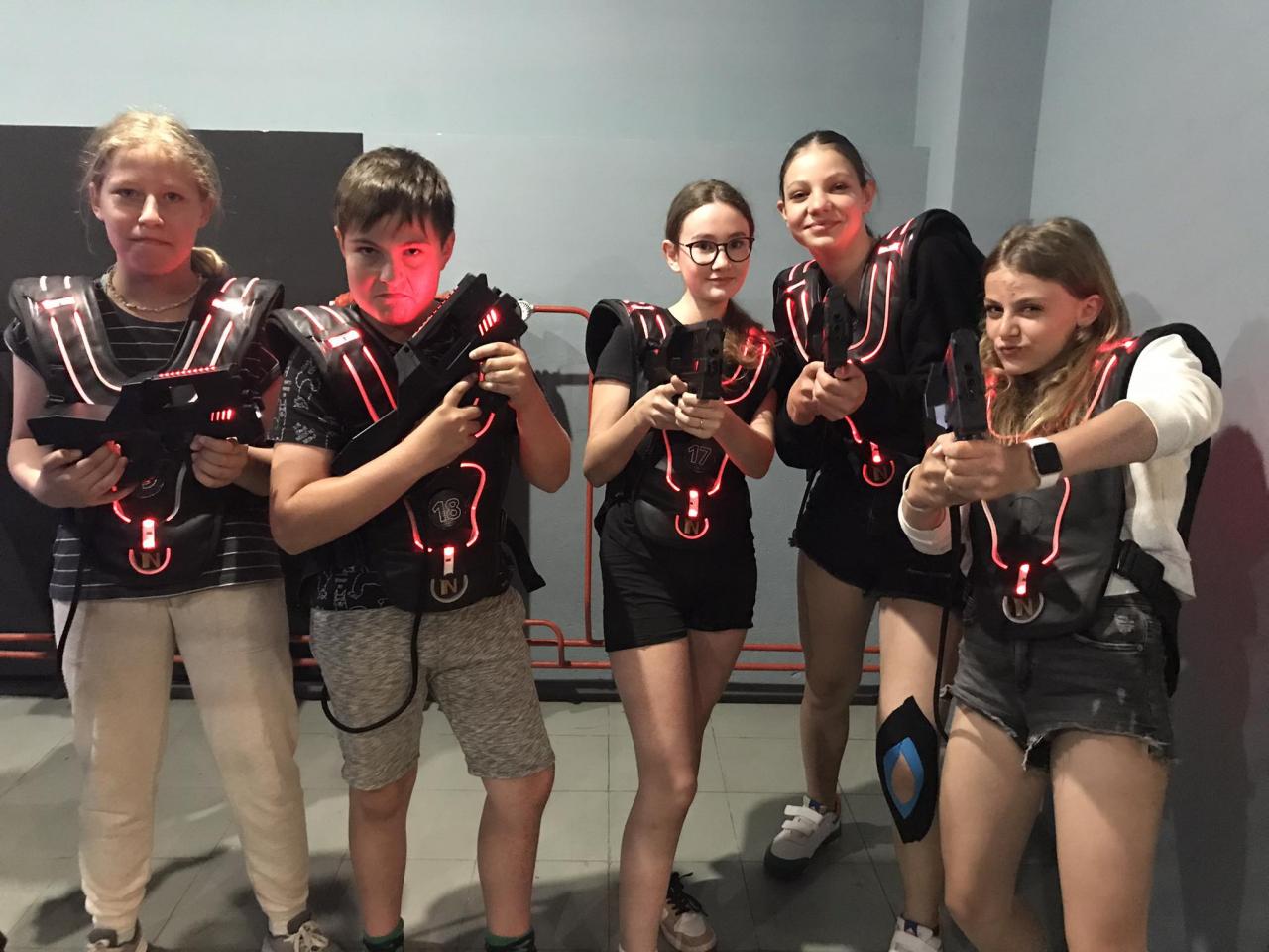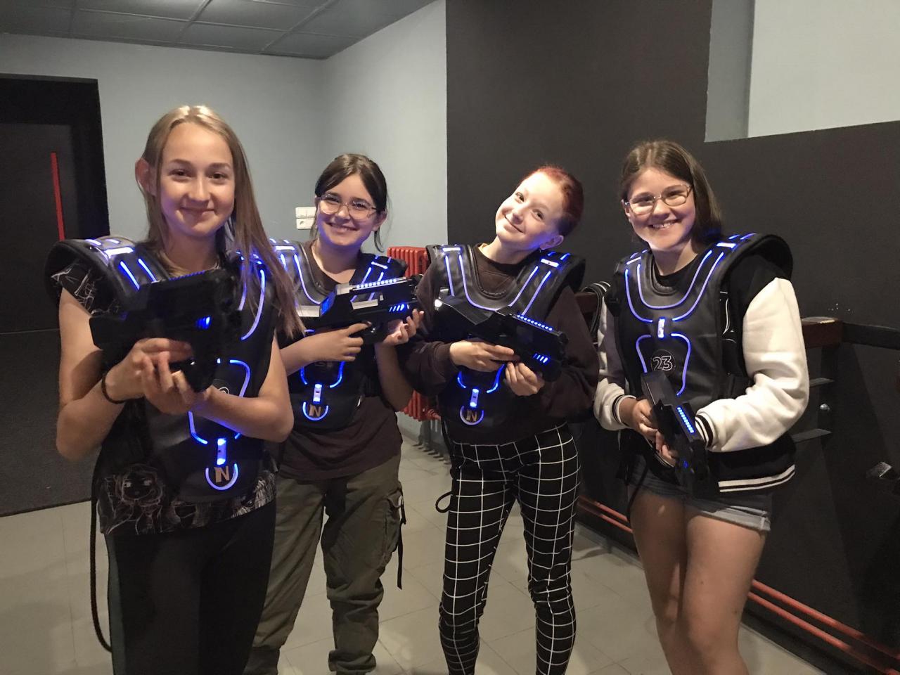 Už dopředu se žáci rozdělili do 4 skupin. V zábavním centru nás tamní lasergame master proškolil o tom, jak se hra hraje, jak se drží zbraň, na co si dát pozor, kde jsou bonusy atd. A pak už mohly první dvě skupiny do arény!