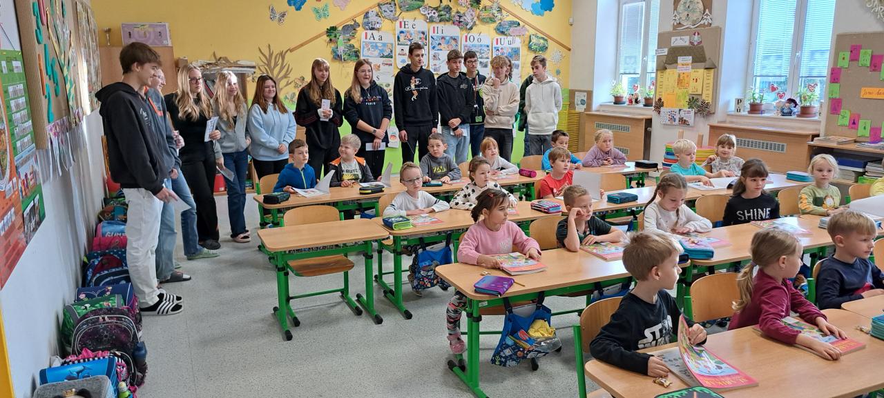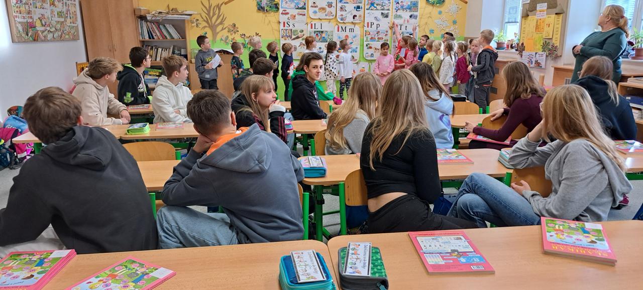 Kamarádi z 9. A přinesli začínajícím čtenářům učebnici, která se stane pro ně na několik měsíců hlavní knihou školního života. Deváťáci napsali do každého slabikáře hezká a povzbudivá slova. Prvňáčci připravili a předvedli krátké pěvecké a recitační vystoupení a každému patronovi předali vlastnoručně vytvořenou záložku do knihy.