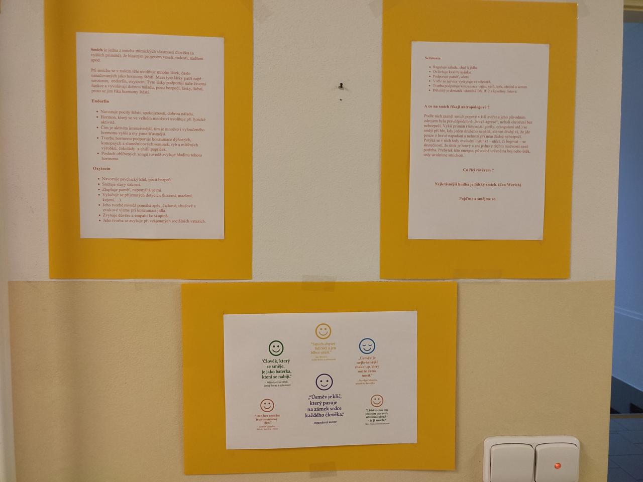 Po chodbách byly rozmístěny barevné plakátky s informacemi o tom, jak blahodárné účinky má smích na naše zdraví. Mohli jsme se dočíst, že smích posiluje imunitu, zlepšuje náladu a dokonce pomáhá proti stresu. A že úsměv je ten nejjednodušší způsob, jak někomu zlepšit den!