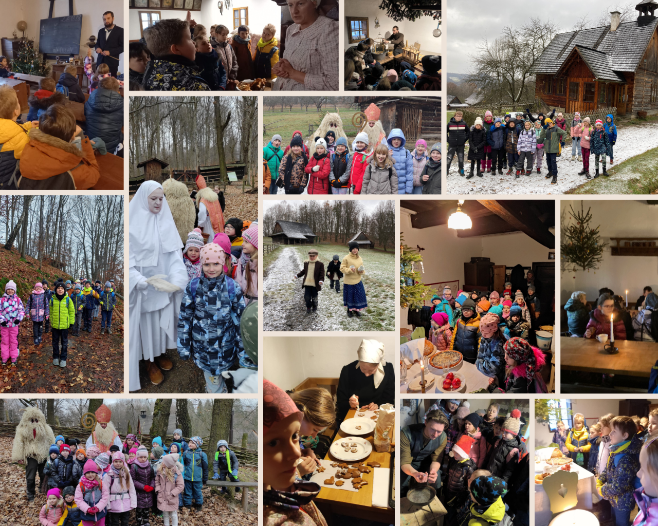 Cestou k chalupám potkáváme také bílou Lucku a Mikuláše s čertem a andělem. Hodný Mikuláš rozdával dětem sušené křížaly a povídal nám o tom, jaké stromy se na Valašku v dávných dobách sadily. Ve škole nás vítá přísný pan učitel a vypráví o tom, jak se dříve ve škole učilo. Od školy už pomalu scházíme dolů do údolí směrem k východu z muzea.