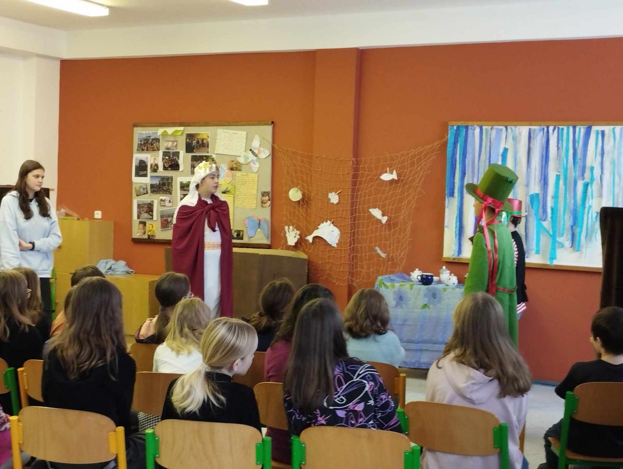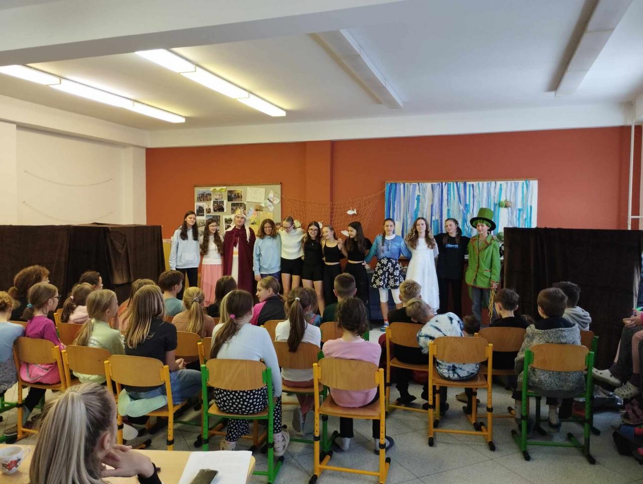 Než jsme mohli začít hrát , museli jsme se naučit scénář a ráno před výukou jsme s paní učitelkou nacvičovali. V představení byla spousta vtipných scének a zajímavých kostýmů, které všechny diváky zaujaly. V hlavní roli byla vodnická rodina, která se potýkala s nedostatkem vody a tak se museli vypravit hledat vládce moří Poseidona, který jim nakonec pomohl problém vyřešit. Užívali jsme si nejen hraní, ale i nacvičování scének, které určitě udělaly radost našim menším spolužákům z I. stupně