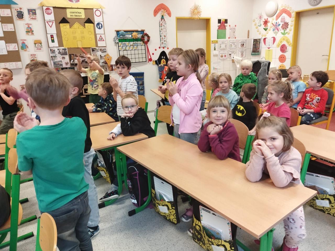 Ve třídě vládla příjemná atmosféra, malí předškoláci se postupně osmělovali a přidávali se k nám. Vůbec se nestyděli, tančili, zpívali, tleskali do rytmu, hráli na doprovodné nástroje.